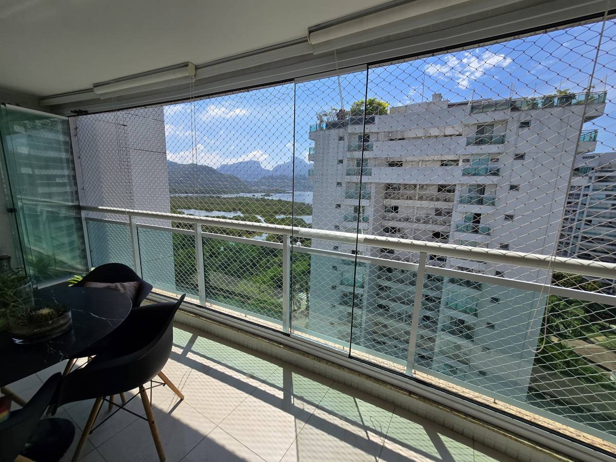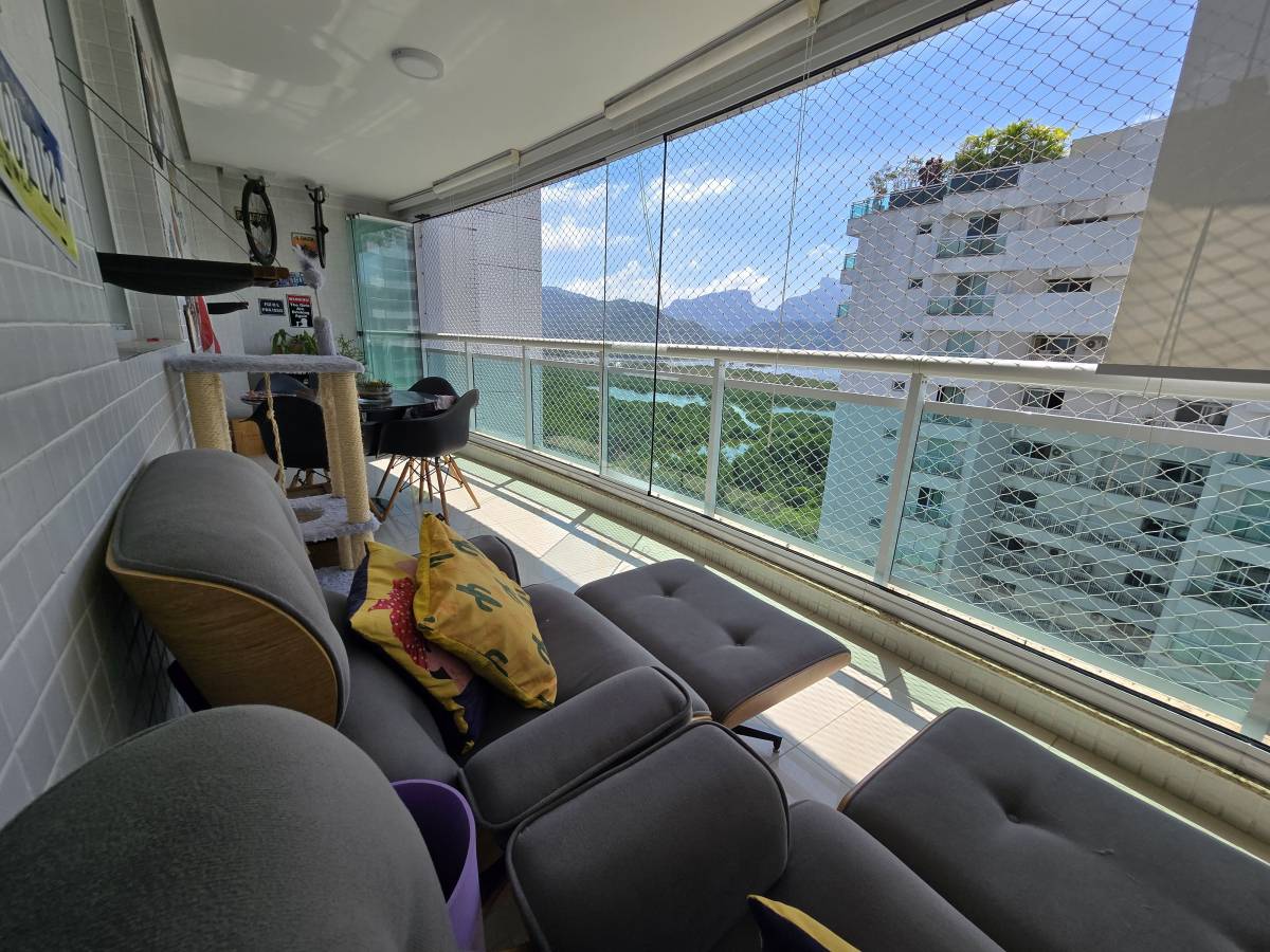 Seus 110m² abrigam uma boa sala com 2 ambientes e uma varanda espetacular com vista panorâmica da lagoa, duas suítes muito confortáveis além de uma cozinha com muito espaço e dependência de serviço completa.